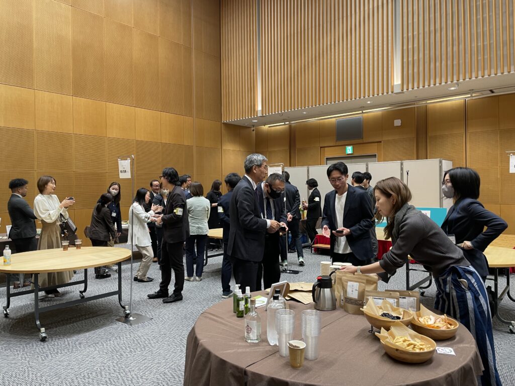 報告会終了後には、隣接会場にて交流会を開催いたしました 。 会場内では、本プログラム採択者の皆様が手掛ける「ヒシ茶(株式会社いなびし様)」や、昨年度採択者の皆様のプロダクト(カジュベース様のドライフルーツ、naturadistill(ナチュラディスティル)様のクラフトジン等)が振る舞われ、福島の豊かな自然と挑戦の成果を五感で楽しむ場となりました 。